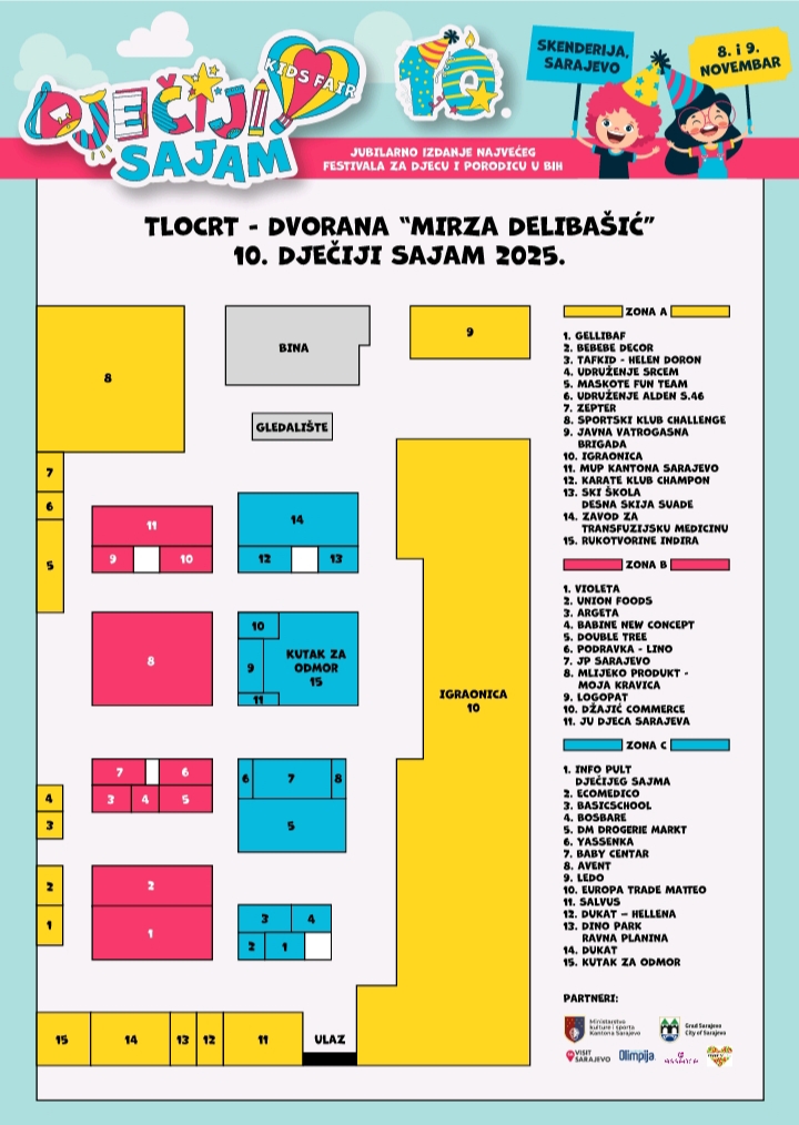 Ovaj jubilej ćemo obilježiti uz još više zabave, iznenađenja i nezaboravnih trenutaka uz podršku počasnih pokrovitelja Ministarstva kulture i sporta KS, Grada Sarajevo, Ministarstva unutrašnjih poslova KS, Javne vatrogasne brigade KS, Javne ustanove „Djeca Sarajeva“, Zavoda za transfuzijsku medicinu FBiH, Visit Sarajevo i mnogih drugih.Tokom dva dana sajma, mališani i njihovi roditelji uživat će u raznovrsnom programu ispunjenom zabavom, kreativnošću i radošću.