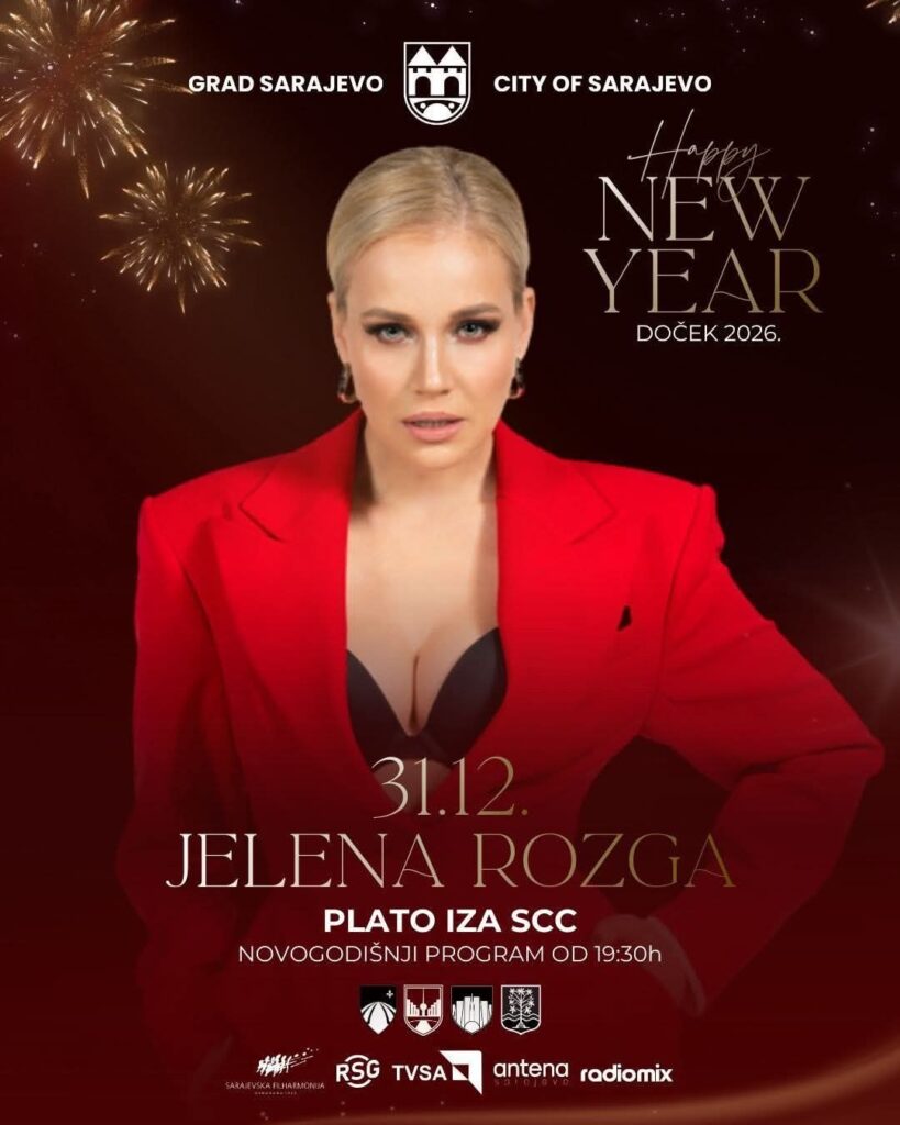 Koncert Jelene Rozge održaće se na otvorenom prostoru iza Sarajevo City Centra (SCC) u utorak, 31. decembra 2025. godine, sa početkom u 23:00. Ulaz na događaj biće besplatan za sve.