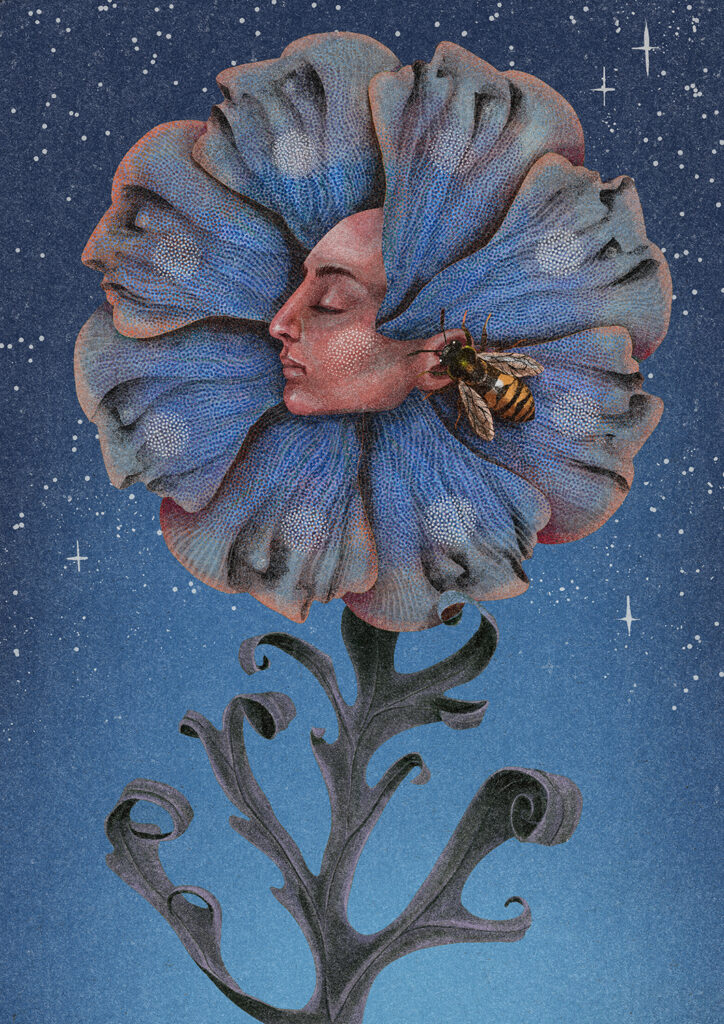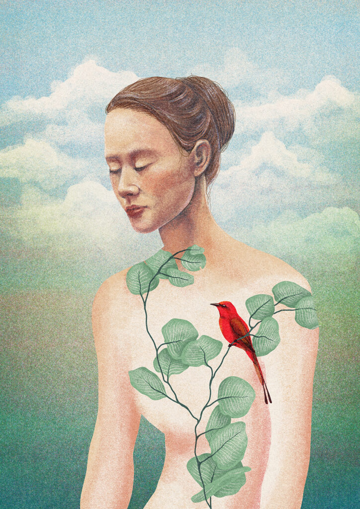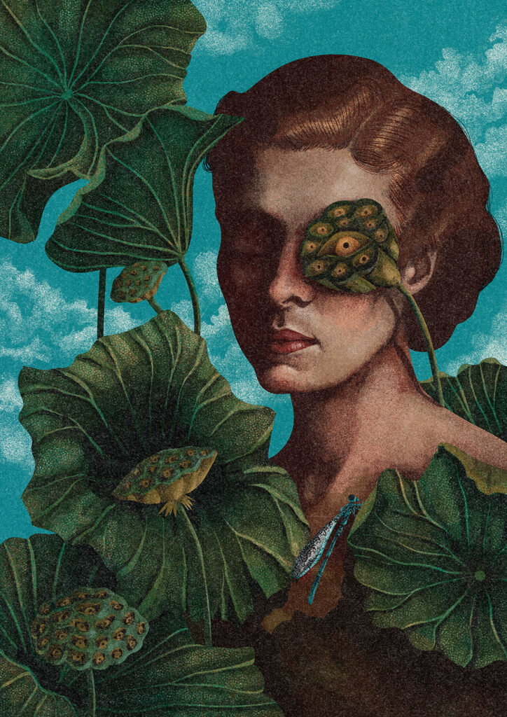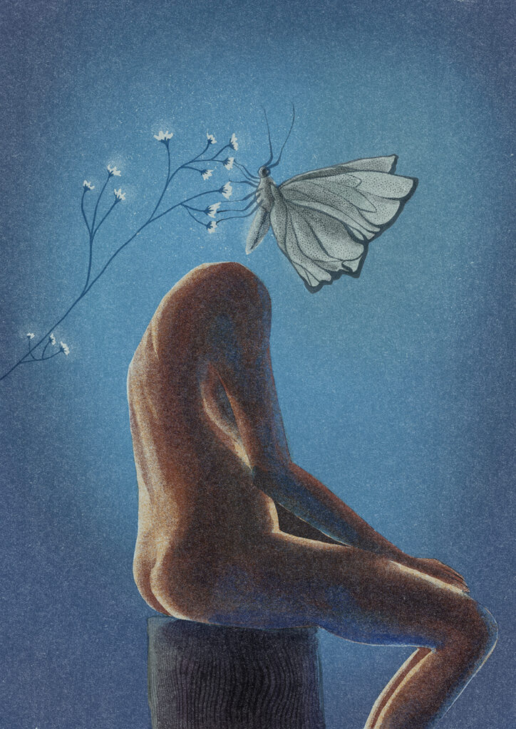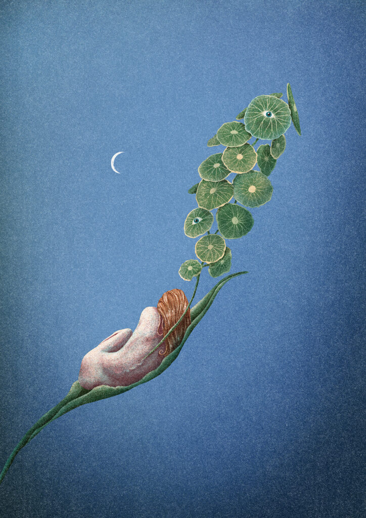 Zavisi dosta od samog projekta, ali proces obično počinje istraživanjem i skupljanjem referenci. Često prikupljam fotografije biljaka, pejzaža ili proučavam ljudsku anatomiju u potrazi za formama i strukturama koje mogu međusobno povezati na zanimljiv i vizualno intrigantan način. Kad oblikujem osnovnu ideju, prelazim na skice i kompoziciju, najčešće digitalno u Procreate-u. U procesu završne obrade eksperimentišem s bojom, teksturom i svjetlom sve dok ilustracija ne dobije atmosferu i emotivni ton koji želim postići.
