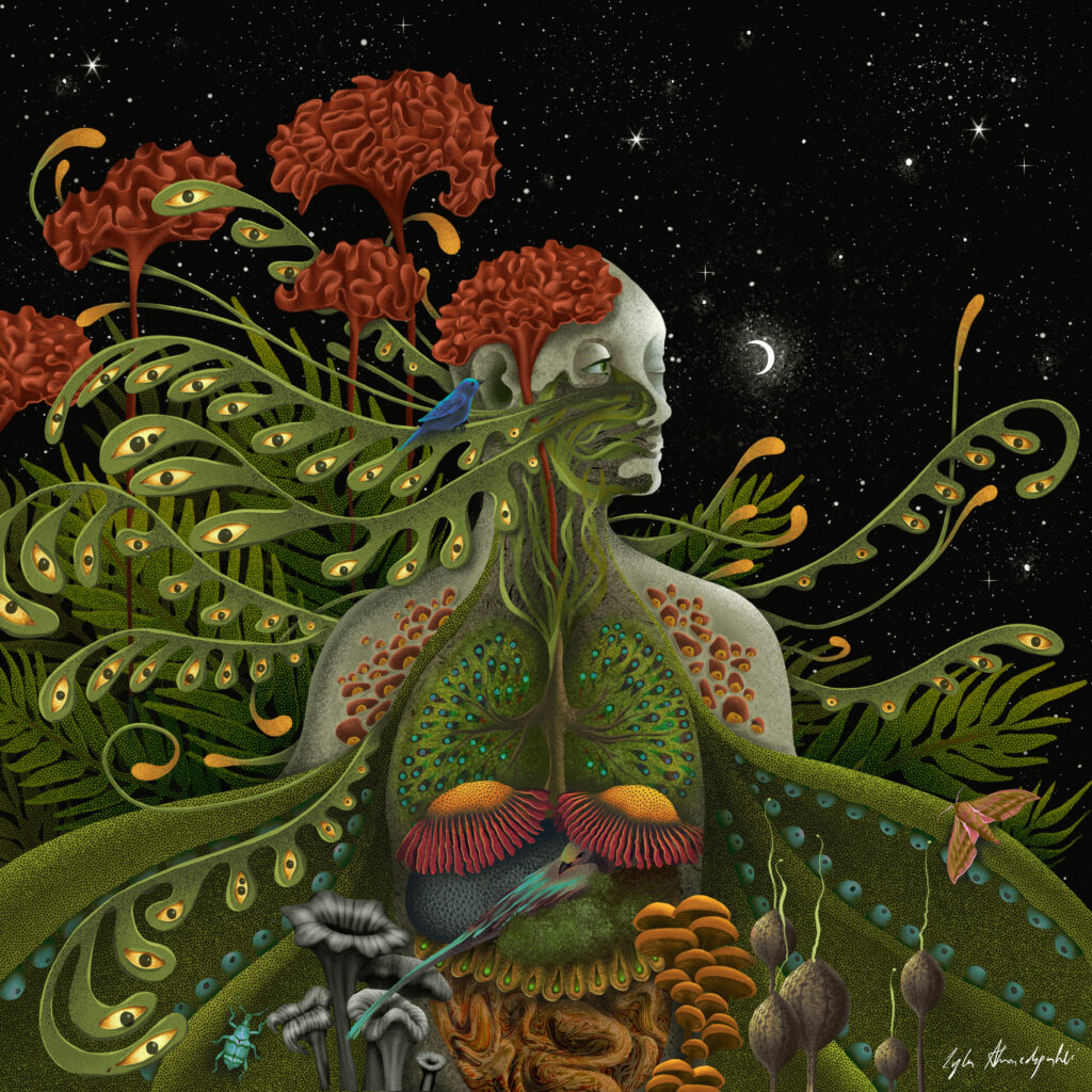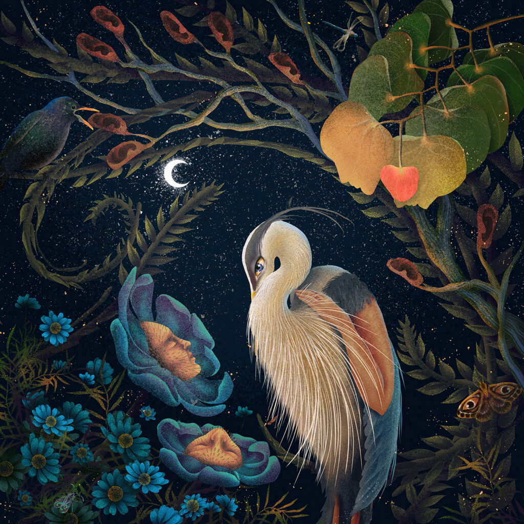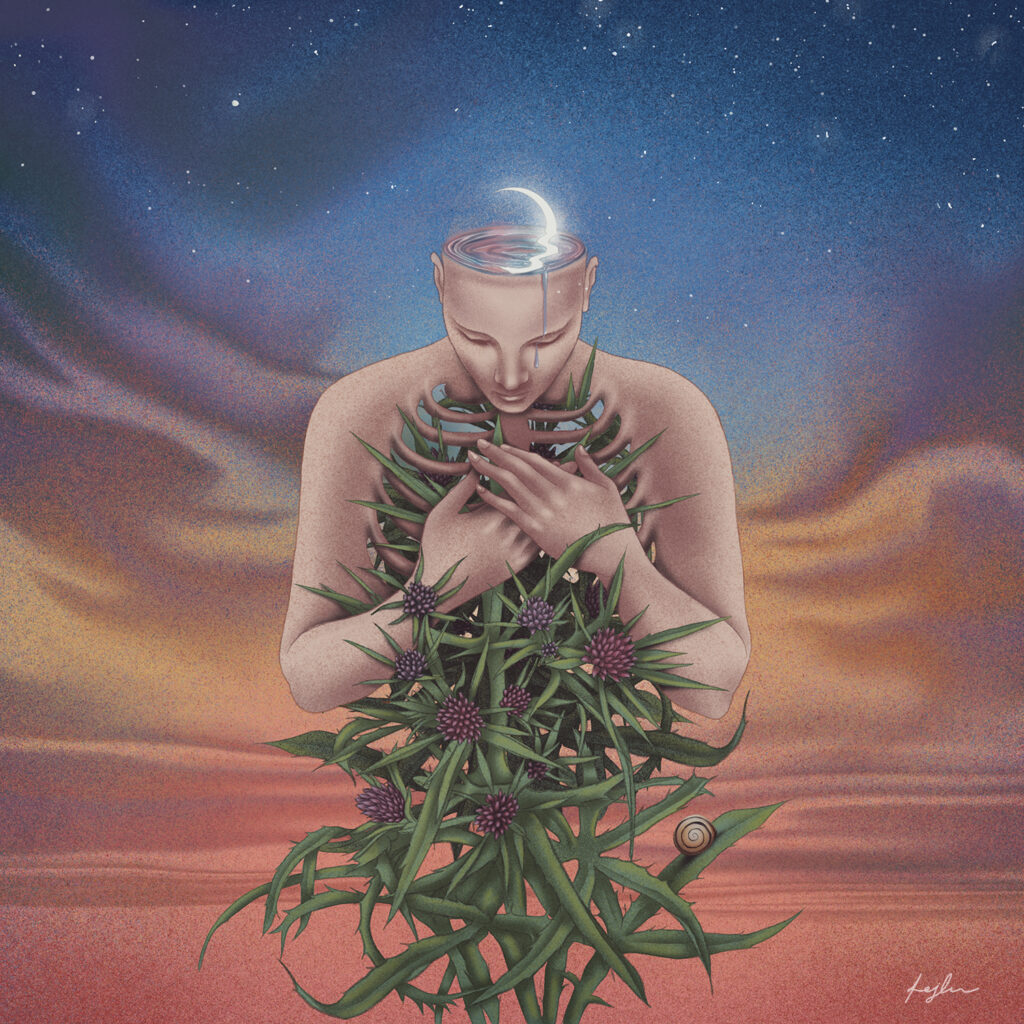 Zavisi dosta od samog projekta, ali proces obično počinje istraživanjem i skupljanjem referenci. Često prikupljam fotografije biljaka, pejzaža ili proučavam ljudsku anatomiju u potrazi za formama i strukturama koje mogu međusobno povezati na zanimljiv i vizualno intrigantan način. Kad oblikujem osnovnu ideju, prelazim na skice i kompoziciju, najčešće digitalno u Procreate-u. U procesu završne obrade eksperimentišem s bojom, teksturom i svjetlom sve dok ilustracija ne dobije atmosferu i emotivni ton koji želim postići.